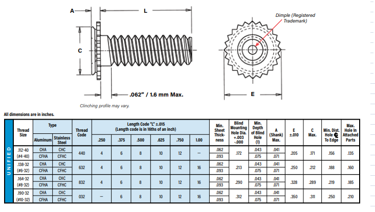 Đinh tán giấu đầu cài vĩnh viễn trong các tấm thép hoặc nhôm mỏng như .062 "/ 1.6mm để cung cấp các sợi mạnh mẽ và có thể tái sử dụng để ghép phần cứng trong một loạt các ứng dụng lắp ráp kim loại mỏng
