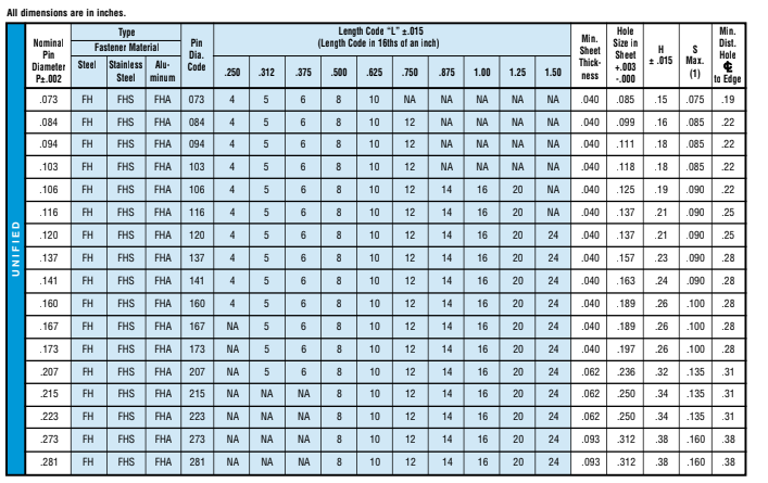 Vật liệu bằng thép, nhôm và thép không gỉ, đinh tán đầu tiêu chuẩn bản vẽ được thiết kế để được lắp đặt ở dạng tấm mỏng đến 0,40 "/ 1 mm.